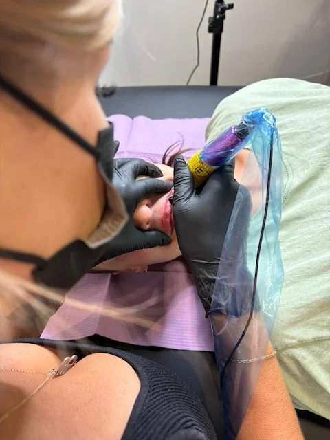 Saline tattoo removal in progress on lip pigment. This gentle technique safely lifts unwanted cosmetic ink for a fresh, natural look.